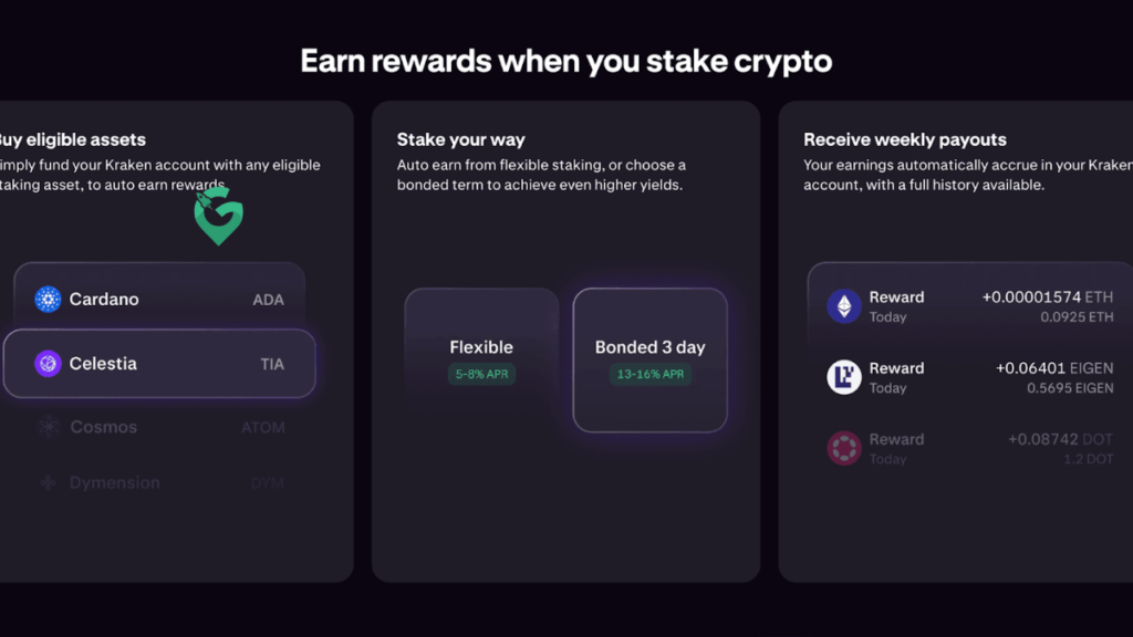 Kraken offers some of the most competitive staking rewards in the industry—up to 22% APR on specific assets (Mina, Celestia, Cosmos, etc.). You can choose flexible staking (unstake at any time) or bonded staking for higher yields. Rewards are paid weekly or bi-weekly directly into your account. In 2026, Bitcoin staking via the Babylon protocol is also available.